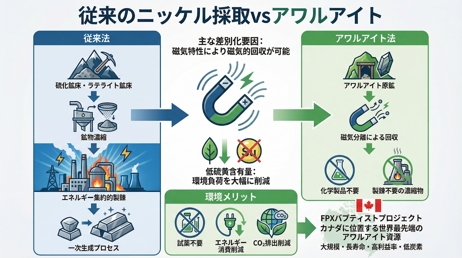 EV電池材料としてのニッケル資源の確保は、すでに企業レベルの取り組みを超え、各国の「国家戦略」として位置づけられる段階に入っています。そうした中、日本政府および日本企業は、カナダのニッケル企業FPXニッケル社(以下FPX社)と協力関係を構築しました。