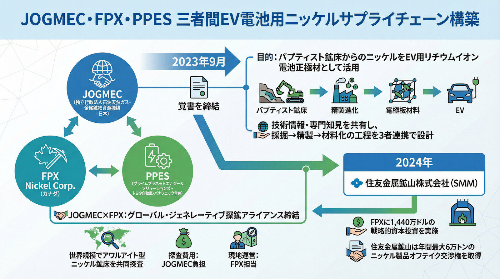 さらに2024年には、日本最大級の鉱山会社である住友金属鉱山が、FPXに対して1,440万ドルの戦略的資本投資を実施しました。この投資により、将来的に年間最大6万トンのニッケル製品に関するオフテイク交渉権を取得しています。