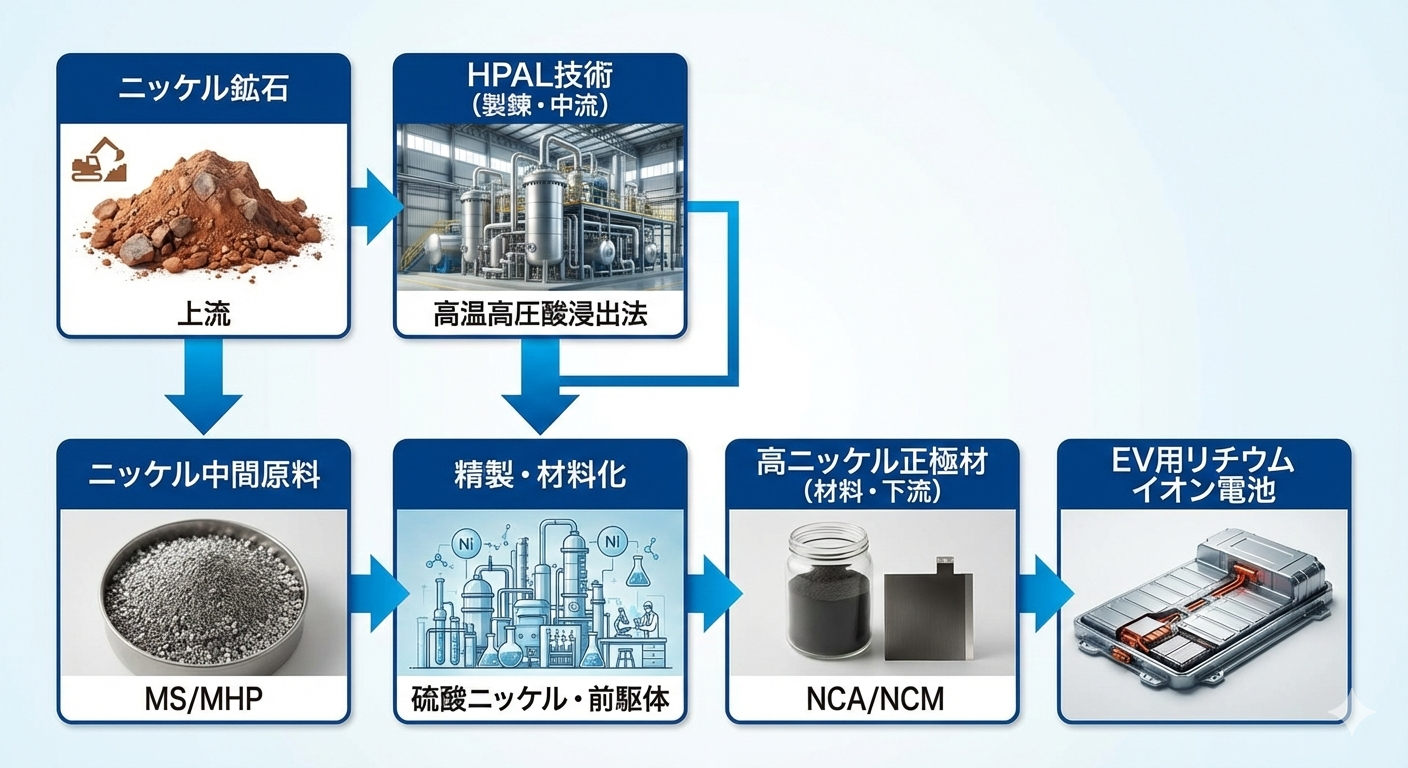 住友金属鉱山のニッケル事業の特徴は、資源開発(上流)から製錬(中流)、電池材料(下流)までを自社グループ内で一貫してカバーしている点です。ニッケルの価値は、鉱石の品位や不純物の性質をどのように製錬・精製し、最終的にどの用途へ転換するかによって変わります。