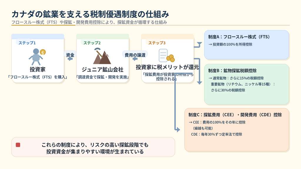 カナダの鉱業が国際的な競争力を持つもう一つの大きな理由が、他国にはあまり見られない手厚い税制優遇措置です。特に投資家にとっても魅力的な、以下の制度がキーポイントとなります。