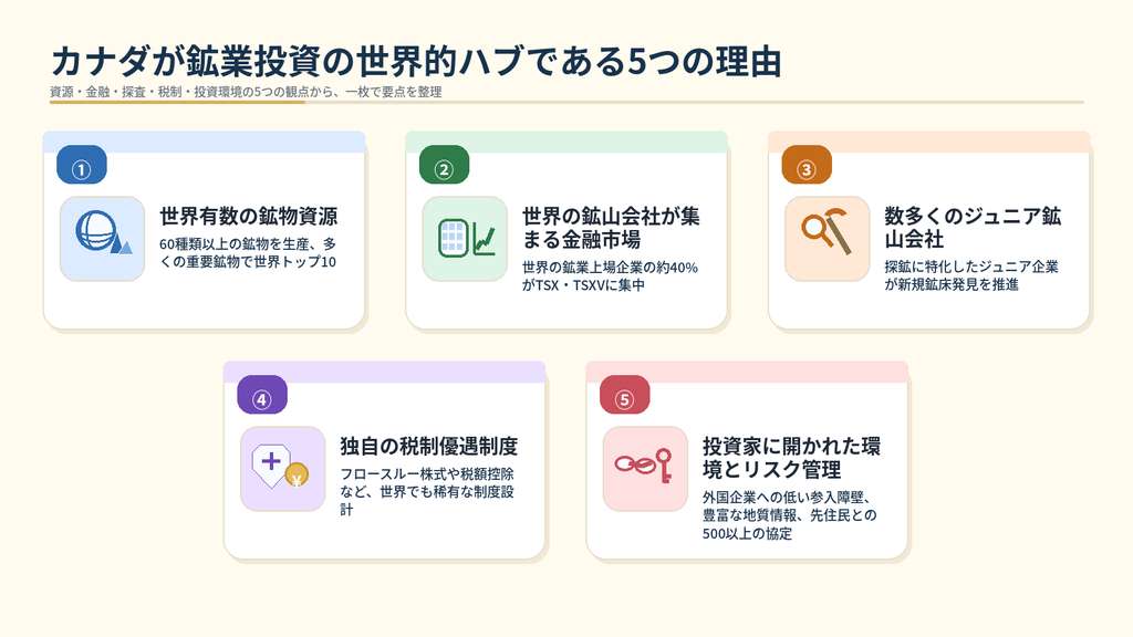 カナダの鉱業セクターは、豊富な資源、世界をリードする金融システム、独自の税制優遇措置、そして持続可能性への取り組みが一体となった環境を作り出しています。これらの強みにより、カナダは単に「資源が豊富な国」という枠を超え、鉱業投資のグローバルハブとしての地位を確立しています。