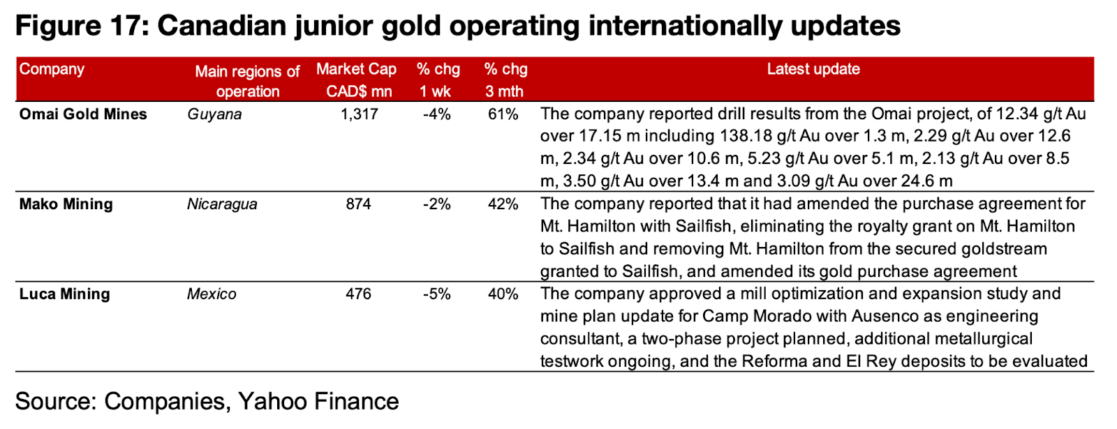 TSXVの金関連銘柄のうち、主に海外で事業を展開している企業では、オマイ・ゴールドがオマイ・プロジェクトからの掘削結果を報告した。マコ・マイニングは、セイルフィッシュとのマウント・ハミルトンに関する購入契約および金購入契約を修正した。ルカ・マイニングは、カンプ・モラードの製錬所最適化・拡張研究および鉱山計画のアップデートを承認した(図17)。