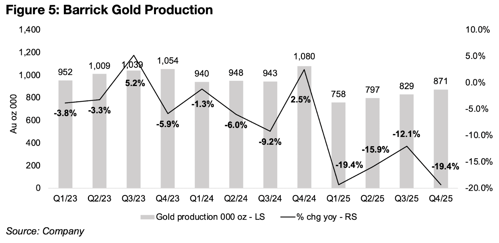 バリックの2025年第4四半期の生産量は前年同期比で-19.1%と低調で、過去4四半期で大幅に減少している(図5)。しかし、この減少は、実現金価格の急騰によって大きく相殺された。実現金価格は4,177米ドルに急騰し、前年同期比で1,500米ドル以上、前四半期比でも700米ドル以上上昇した(図6)。