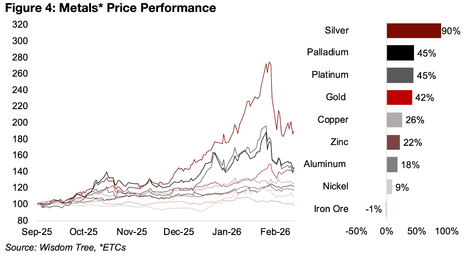 一方、パラジウムとプラチナの上昇率は金に収束しつつある。過去1週間でパラジウムは-0.3%、プラチナは-3.3%下落したが、2025年9月以降では両金属とも45%上昇している。