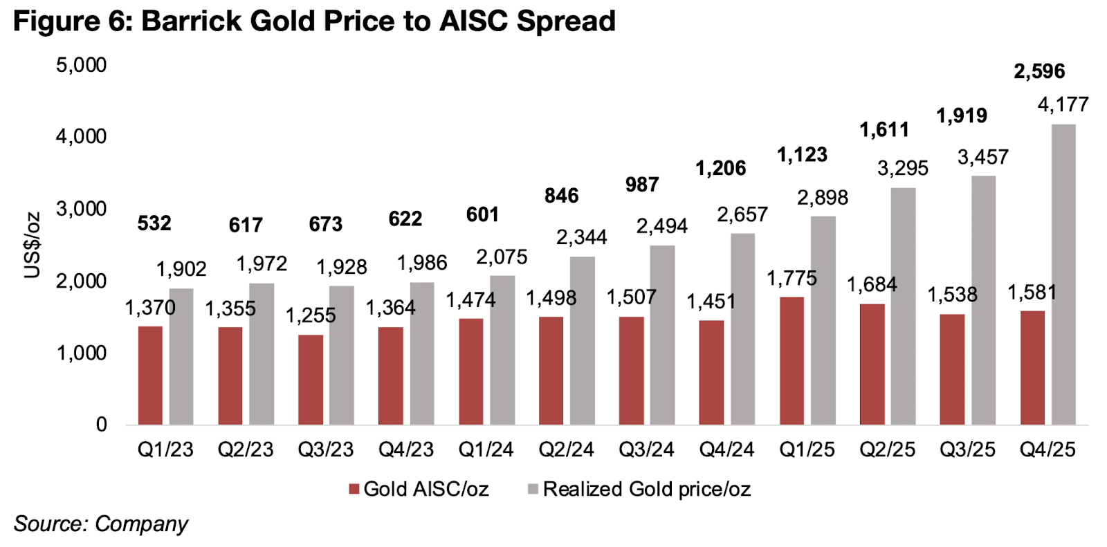 一方、1オンス当たりのAISC(オールイン・サステイン・コスト:金鉱山の操業継続に必要な総コストを示す指標)は前年同期比でわずか130米ドル、前四半期比で43米ドル上昇にとどまった。AISCに対する実現金価格のスプレッドは2,596米ドルと、2024年第4四半期の1,206米ドル、2025年第3四半期の1,919米ドルから大幅に拡大した。