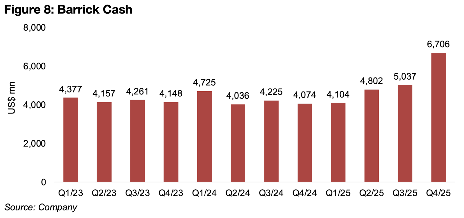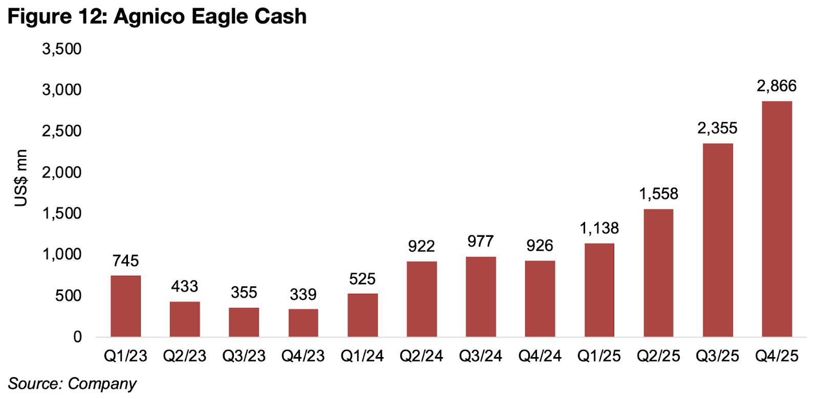 現金残高は昨年大幅に増加した。2023年には特にニューモントやバリックと比較して比較的低水準であったが、2024年第4四半期の9億米ドルからほぼ3倍の28.7億米ドルに増加した(図12)。
