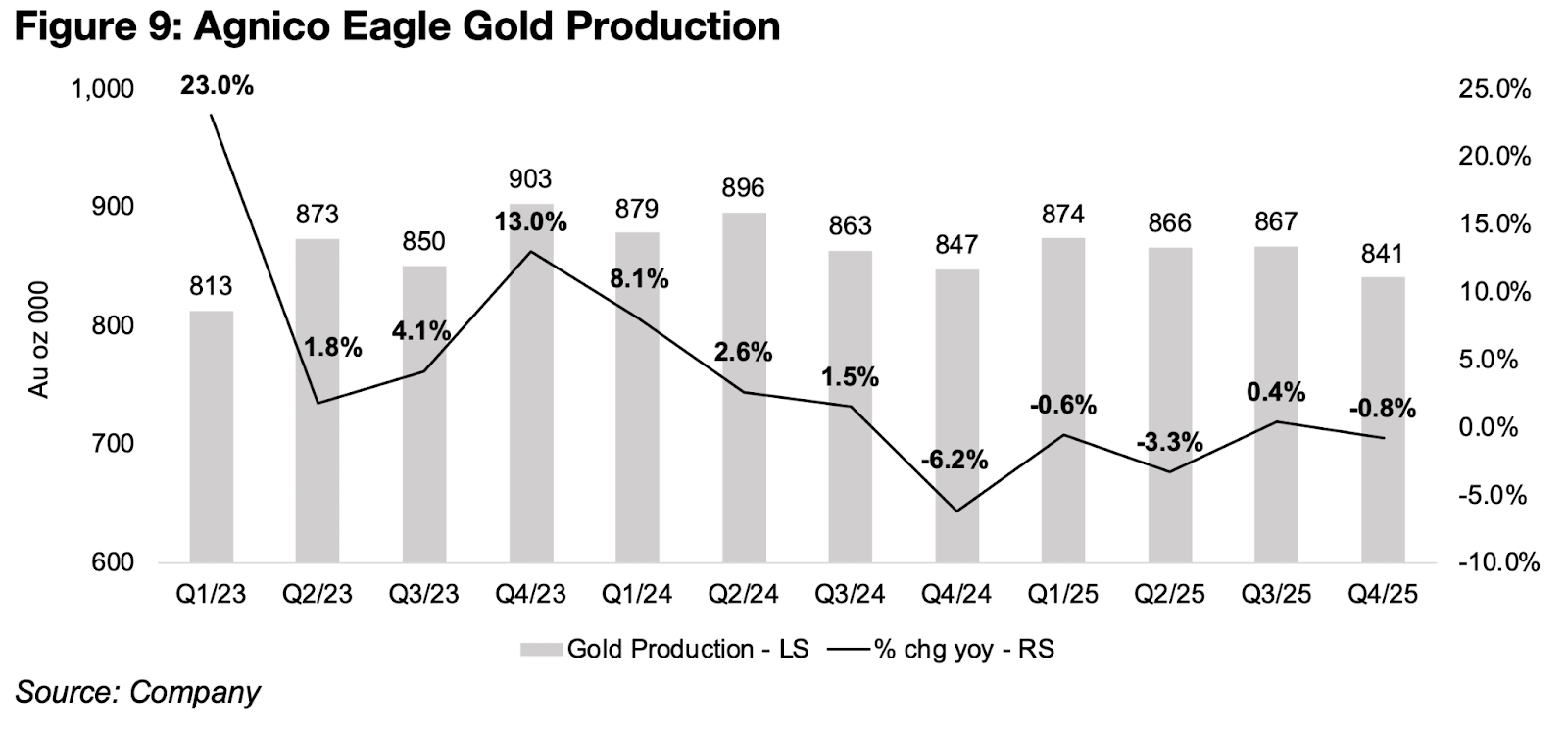 2025年におけるアグニコ・イーグルの生産量は全体的に減少した。2025年第3四半期にわずか0.4%の増加にとどまったものの、マリにおける開発の影響によるバリックの生産量減少に比べればはるかに緩やかな減少となった(図9)。