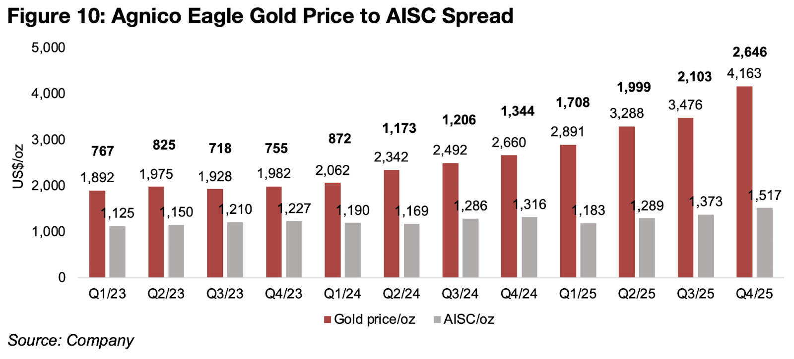 同社の実現金価格は2025年第4四半期に4,163米ドルとなり、コスト上昇をはるかに上回っている。しかし、AISCの上昇率は前年比201米ドル、前四半期比144米ドルと、バリックよりも高い(図10)。