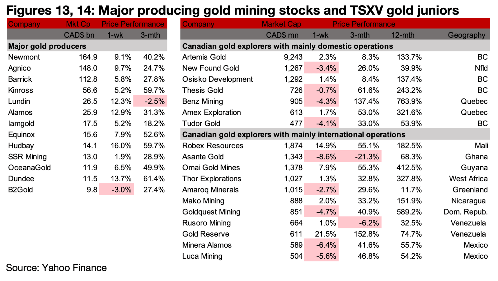 メジャー金鉱会社はB2ゴールドを除きほぼ全て上昇したが、TSXVの金関連銘柄はまちまちであった(図13、14)。