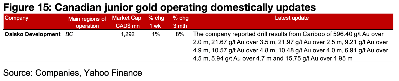 TSXVの金関連銘柄のうち、主に国内で事業を展開している企業では、オシスコ・ディベロップメントがカリブー・プロジェクトのインフィル掘削結果を報告した(図15)。