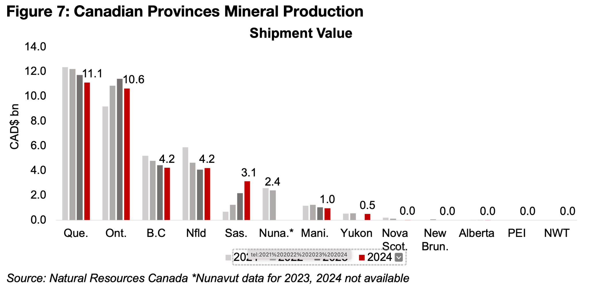 オンタリオ州は鉱物生産において主要な場所であり、2024年の出荷額は106億カナダドルで、これはケベック州の111億カナダドルに次ぐ規模だ。一方、サスカチュワン州は比較的小規模であり、鉱物出荷額は31億カナダドルと全国5位にとどまる(図7)。