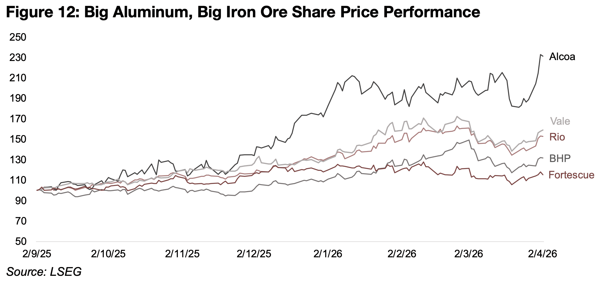 図12:大手のアルミニウム企業と鉄鉱石企業の株価パフォーマンス
