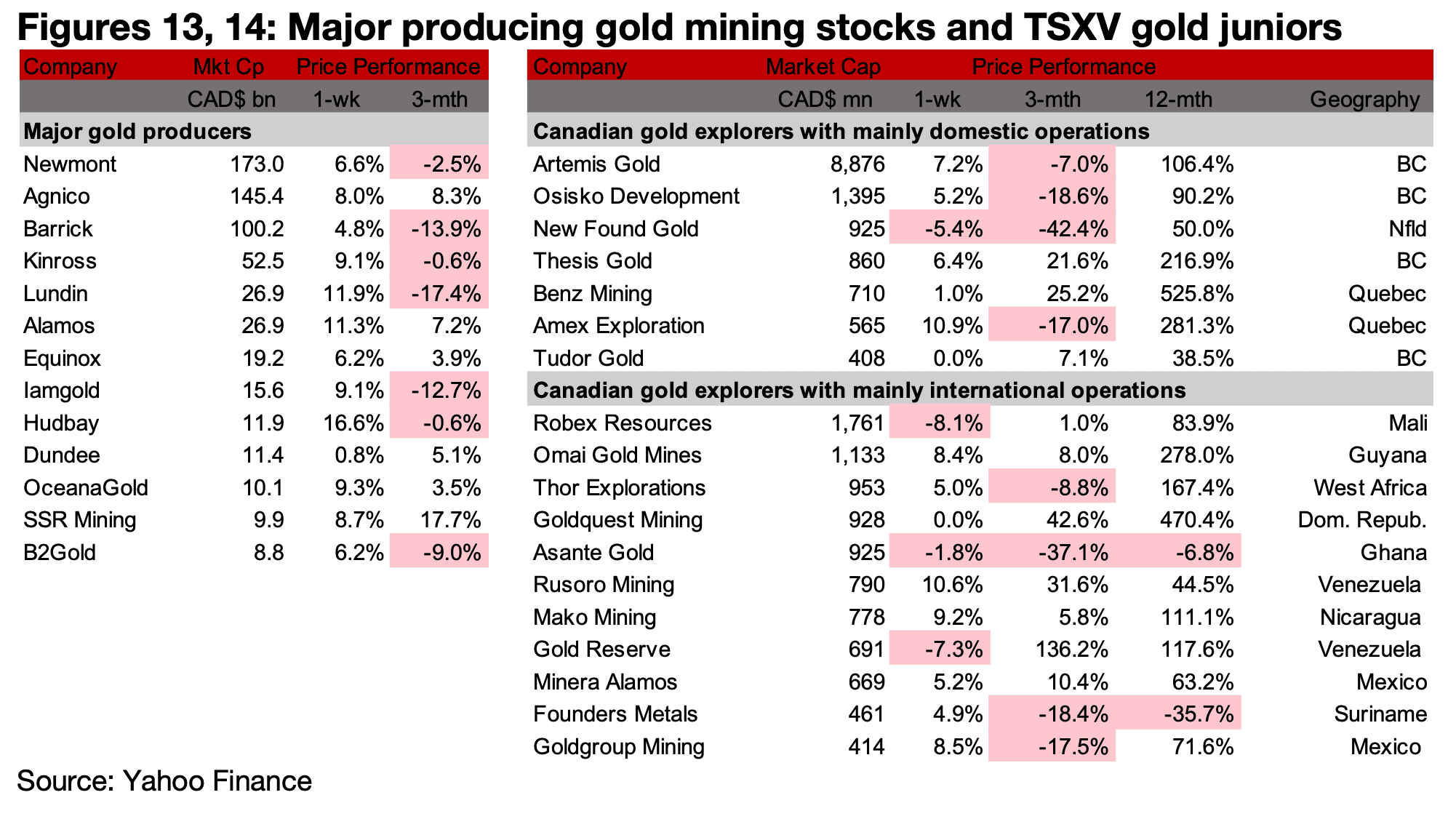 金価格の上昇を受け、メジャー鉱山株とTSXVの金関連銘柄の大半は株価が回復した。(図13、14)