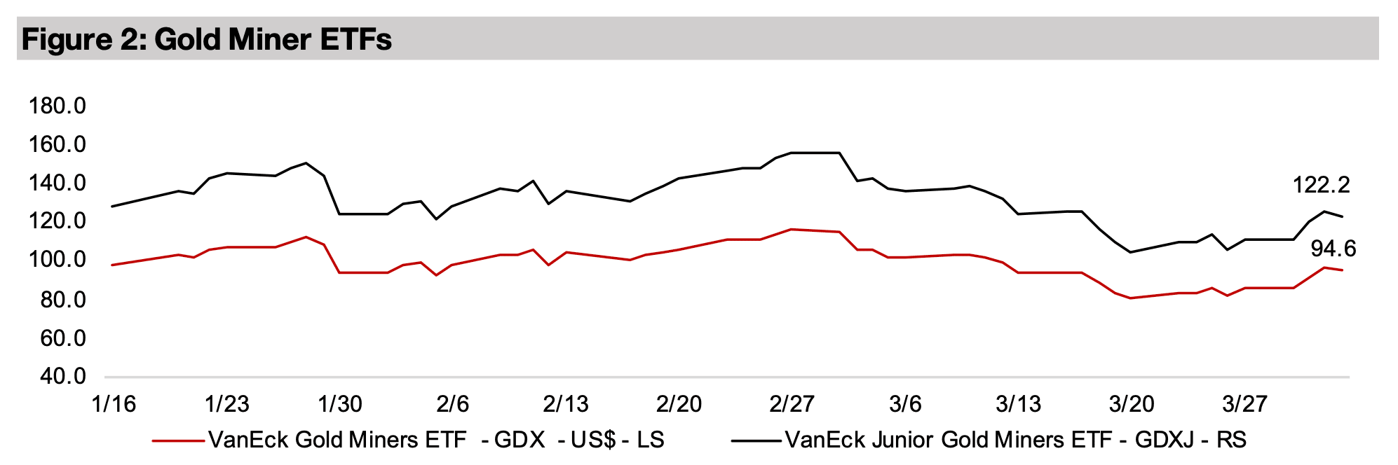 図3:金先物および金鉱株ETFの価格パフォーマンス