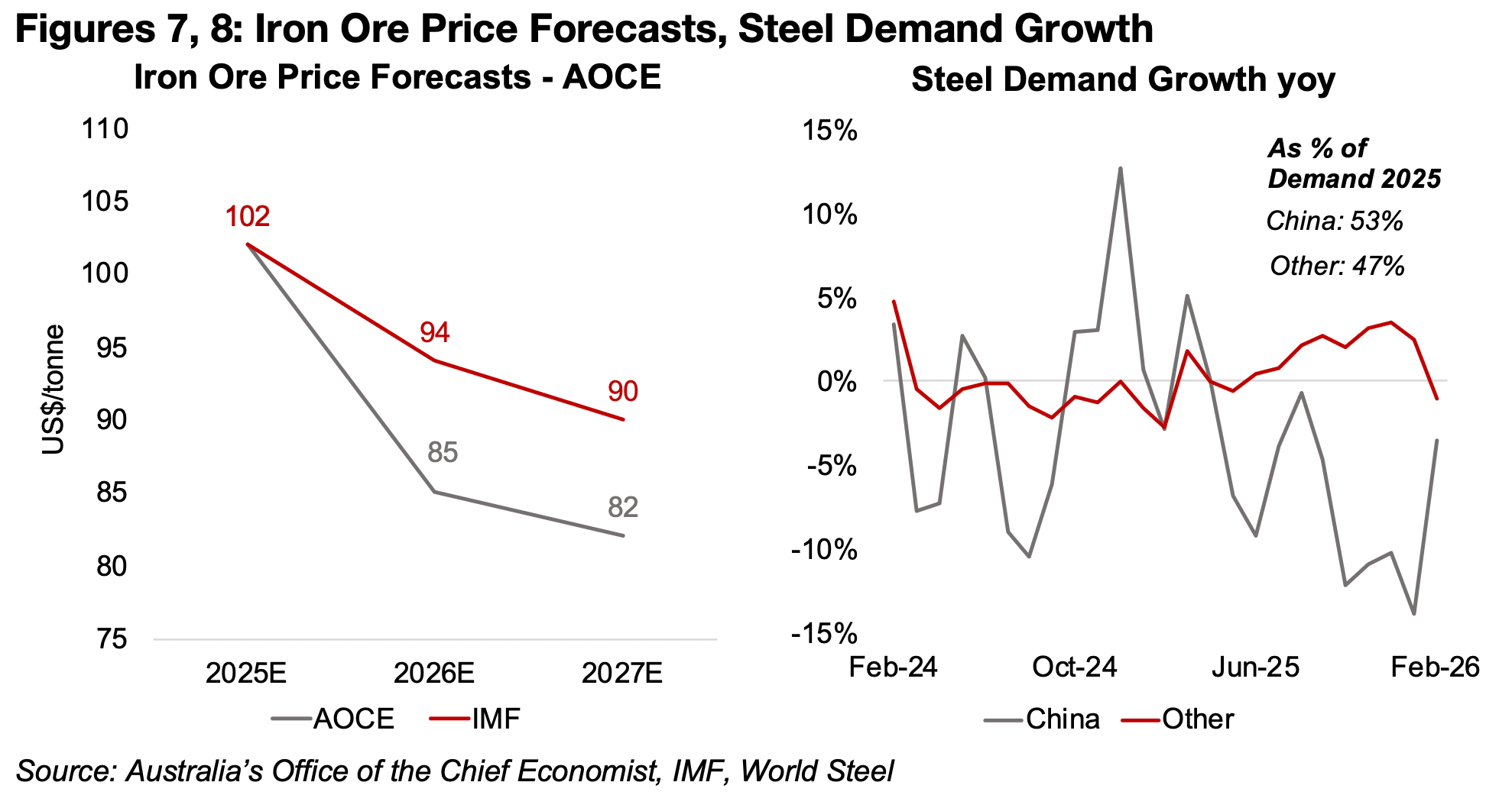 図7、8:鉄鉱石価格の予測、鉄鋼需要の伸び