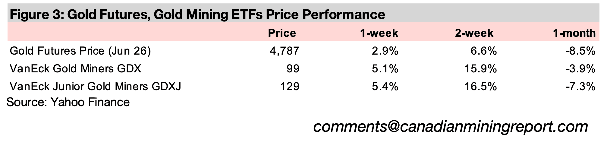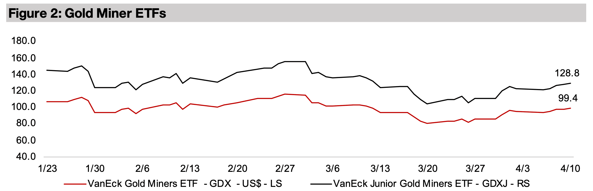 図3:金先物および金鉱株ETFの価格パフォーマンス