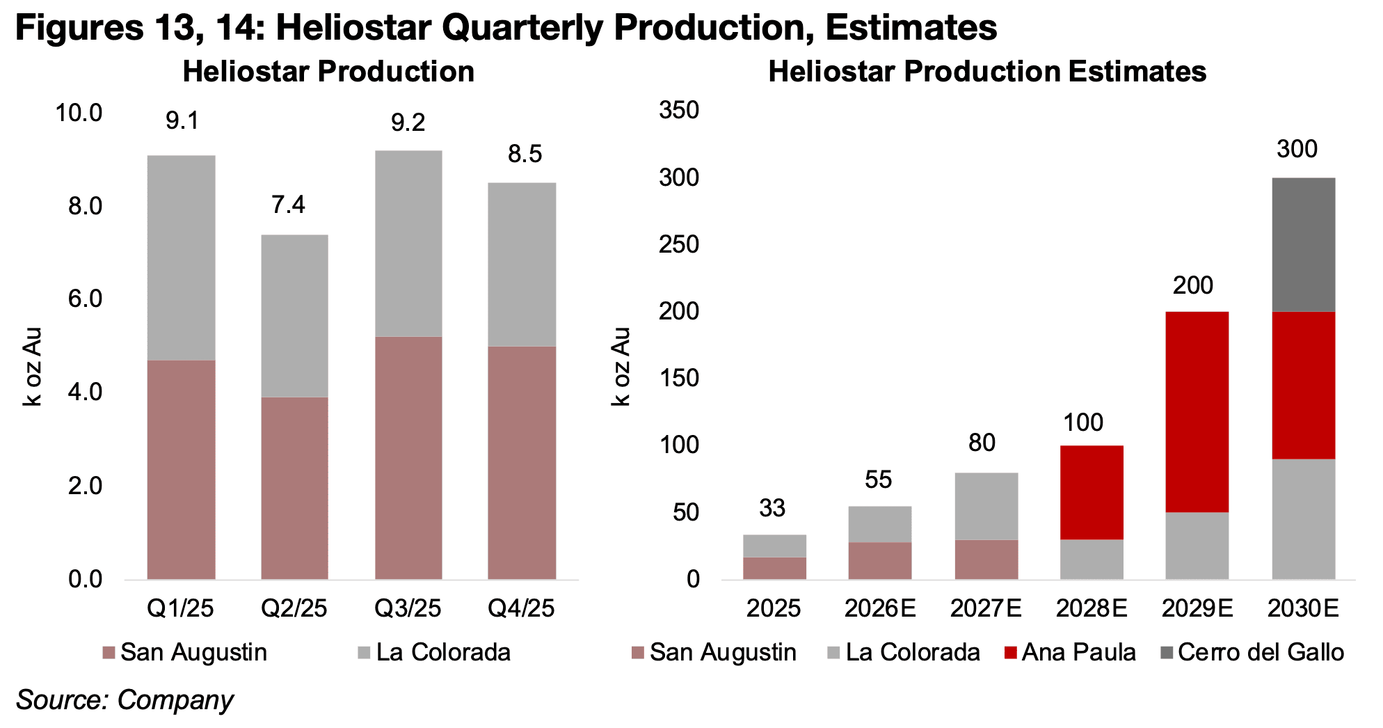 ヘリオスターは、今後数年間で生産量の大幅な拡大を見込んでいる。2025年の33,000オンスから、2026年には55,000オンス、2027年には80,000オンスへと段階的に増加し、2028年には主力がアナ・パウラ鉱山へ移行することで、年間100,000オンス規模に到達する見通しだ(図13、14)。