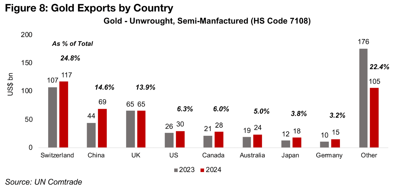 国連商品貿易統計によれば、スイスは未加工または半製品の金を1170億米ドル輸出し、これは世界全体の24.8%を占めた(図8)。一方、金化合物の市場規模ははるかに小さく、2024年にスイスは5億米ドルを輸出して22.6%のシェアを確保し、首位となった(図9)。